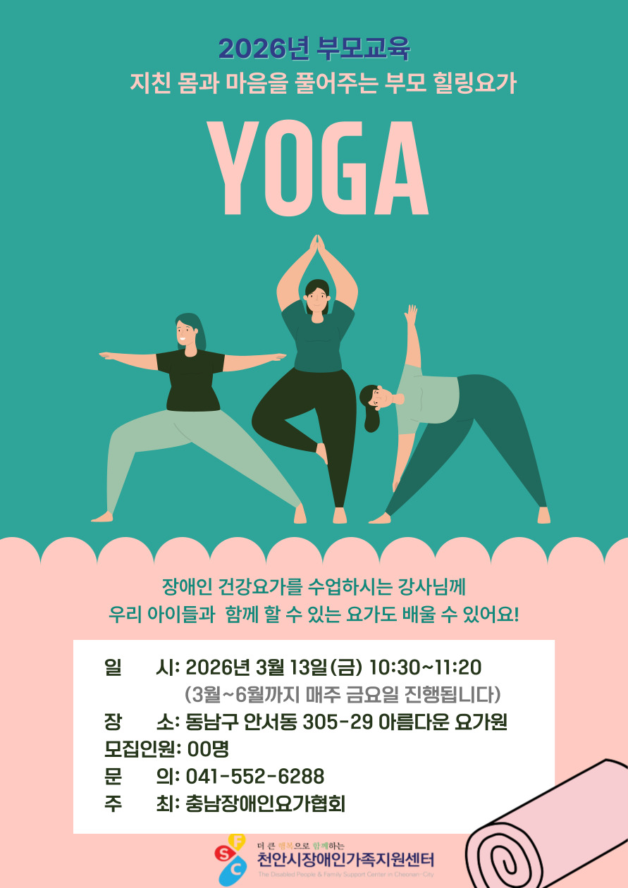 2026년 부모교육 - "지친 몸과 마음을 위한 부모 힐링요가" 페이지 정보 작성자 가족지원센터 댓글 0건 조회Hit 18회 작성일Date 26-03-05 16:00 본문 * 많은 관심과 참여 부탁드립니다. 목록 다음글2025년 12월 소식지 발간 ♡ 26.01.05